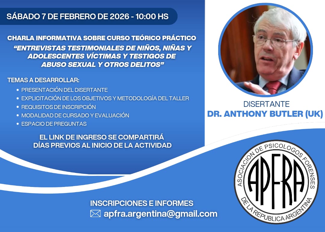 APFRA invita a participar en forma gratuita y de modo virtual a la charla informativa del curso teórico práctico “Entrevista testimonial de niños, niñas y adolescentes víctimas y testigos de abuso sexual y otros delitos” dictado por el “Dr. Anthony Butler” (UK) el sábado 8 de febrero 2026 a 10hs.